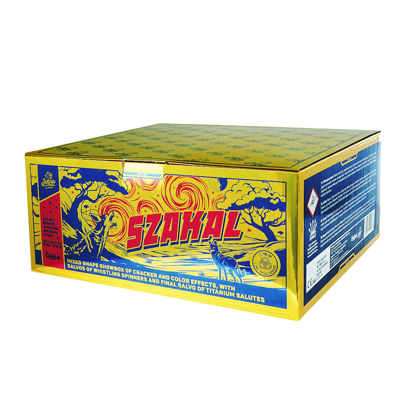 Showbox aus Farb- und Cracker-Effekten in wechselnder Fächerung, mit Kreischwirbel-Salven und Titansalut-Finale.
