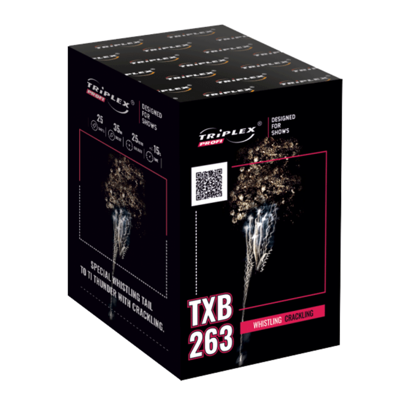 Ein rauer Pfeifschweif voller Sterne, endend mit einem lauten Knall und Crackling.